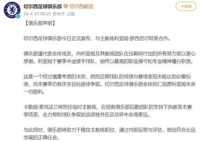 切尔西在公告中这样写道:“做出这一决定(换帅)并非俱乐部轻率之举,然而最近的比赛结果和球队表现未能达到应有的标准,而本赛季仍有大量重要比赛等待我们去完成。切尔西足球俱乐部的全体成员祝愿罗塞尼尔在未来一切顺利。此外,卡勒姆-麦克法兰将担任临时主教练,带领球队直至本赛季结束,并由俱乐部现有教练组成员协助。我们将继续努力争取获得欧洲赛事资格,并在足总杯中取得进步。在俱乐部为主教练职位寻求稳定人选的过程中,我们将进行自我反思,以做出正确的长期任命。”